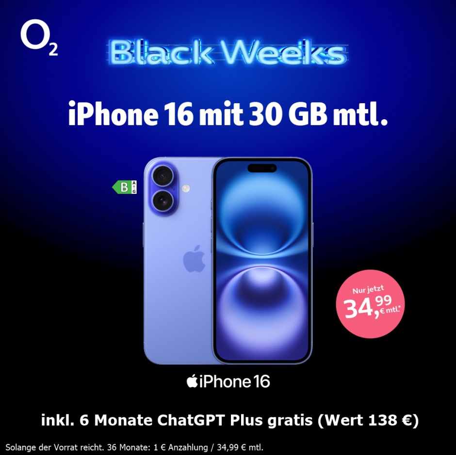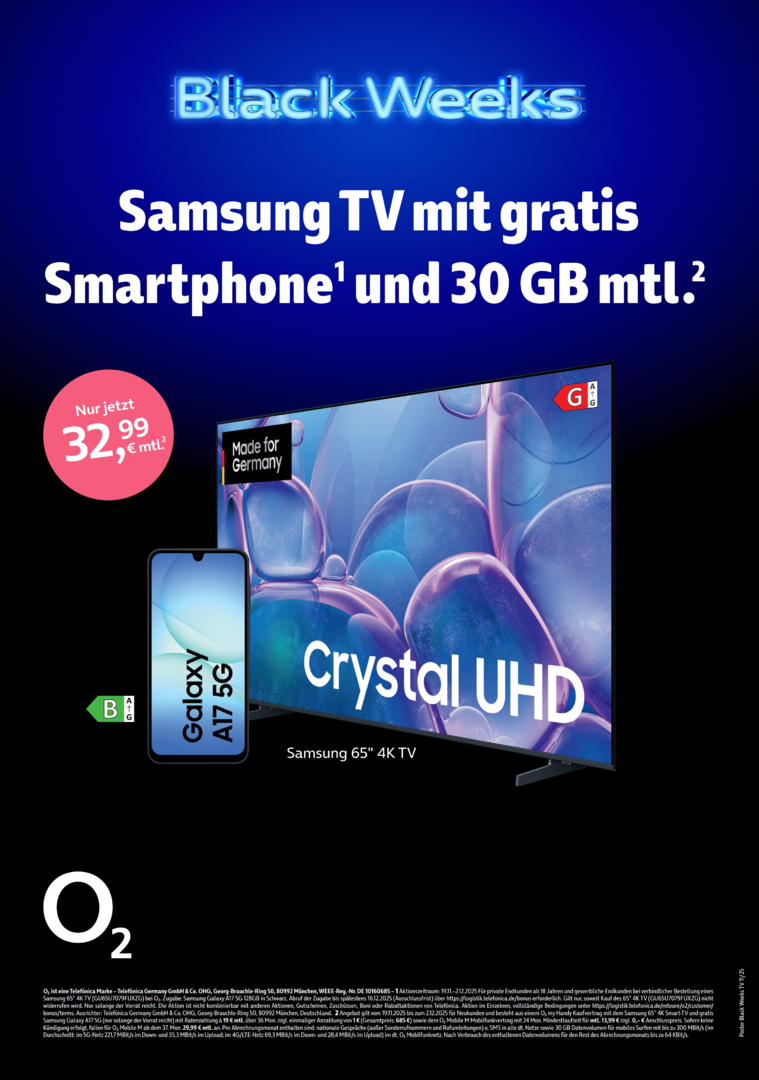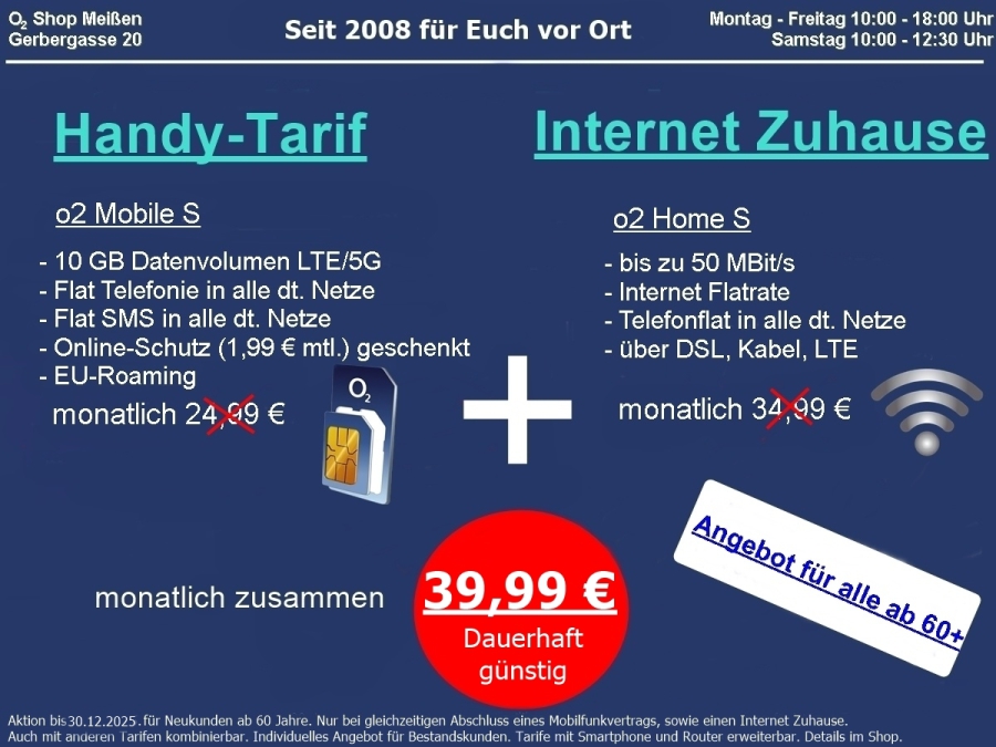 Aktion bis 2.12.2025 Laufzeit 24 Monate. Einmaliger Anschlusspreis 9,99 €, statt 49,99 €. Preis 34,99 € gilt für o2 Mobilfunkkunden mit Kombi-Vorteil berechtigten Tarif. |