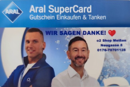 Wer von den Riesaern bei uns einen o2 Mobilfunk- oder DSL-Vertrag abschließt oder seinen o2 Mobilfunkvertrag verlängert, beschenken wir mit einer 25 € ARAL-Tankkkarte.